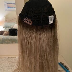 Godivas secret STP(smooth top plus)—their thickest synthetic topper in Creamy Toffee Rooted; average size with 4 clips