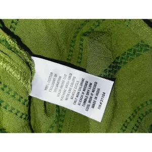 This is a pre-owned Crown & Ivy blouse, size Large. It features long sleeves and is made of 100% cotton, exclusive of decoration. The blouse is olive green with darker green horizontal stripes and zig-zag patterns. It has a gathered neckline with tassel details.
