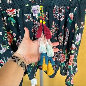 Johnny Was Harley Boho Peasant Floral Top w/ Colorful Tassels