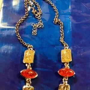 22 inch silver tone necklace with lobster claw clasp. Although the settings look like amber , I don’t believe they are .