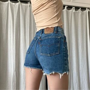 Stylish Levi's denim shorts. No zipper. Full button up. Nice thick denim cut offs. Extremely comfy and perfect for warmer months. Dark wash.