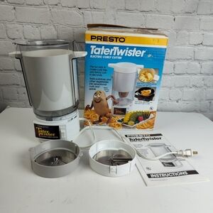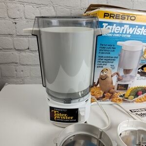 The 1990 Presto Tater Twister, model 02930, is a white electric potato and veggie curly cutter designed to effortlessly create fun and curly cuts from vegetables. Made of plastic, this Tater Twister comes with a bowl for convenience and is easy to clean, either by hand or in the dishwasher. This kitchen tool is suitable for slicing vegetables and is manufactured in China