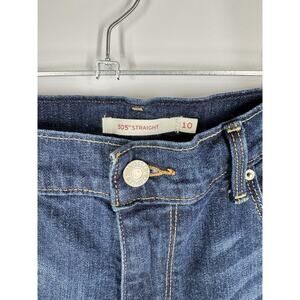 Levi's 505 Straight leg Women's jeans in size 10, made of medium wash blue denim with a 30-inch waist and a 30.5-inch inseam. The jeans feature a 5-pocket design with button and zipper accents, a mid-rise fit, and a classic straight leg style. The fabric is a cotton blend with a medium fabric wash, and the brand is Levi's, known for its timeless and durable denim products.