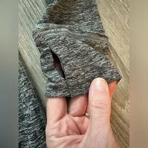 This is super soft, and soooo comfy to wear! Has thumb holes! And the neck is almost like a turtleneck/hoodie.