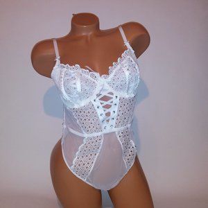 Victoria Secret Lingerie Teddy One Piece Bodysuit White Eyelet Sheer Thong Back