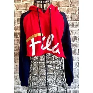 NWOT Fila Cropped Hoodie Large Red Navy Drawstring Logo Fleece Lined Swe…