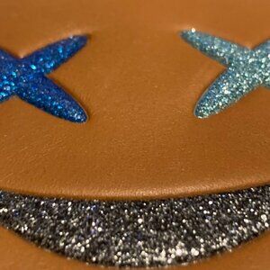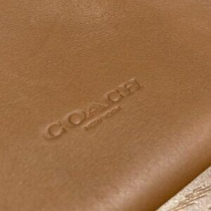 Smooth tan leather with a glitter accent design. Secure zip-top closure. Polished hardware with Coach logo detail. Wrist strap for easy carrying. Fabric-lined interior with card slots to keep things organized. Compact and stylish for all your essentials.