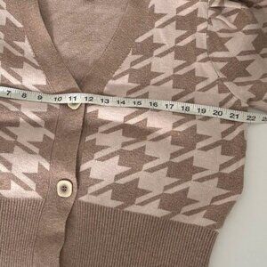 Joie Cardigan Large Tan V Neck Houndstooth Puff Sleeve Old Money Preppy Academia