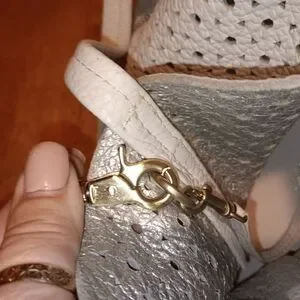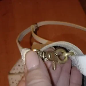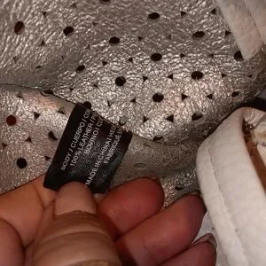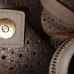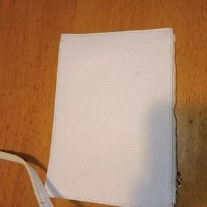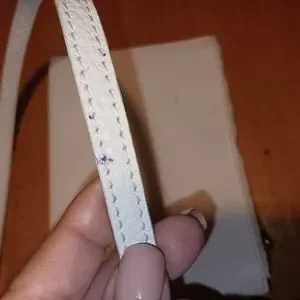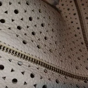This stylish white tote bag features a chic perforated design, perfect for any occasion. Its elegant look makes it a versatile accessory for your wardrobe. Perfect for spring and summer has great zipper detail good snap closure had small pen mark on crossbody strap I cleaned it good but still small spit there the Wristlet had to tiny marks on it that would not come off hardly noticeable. The back is bright white super clean and soft interior is silver leather. This is not a cheap bag.