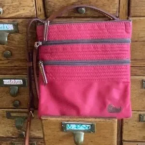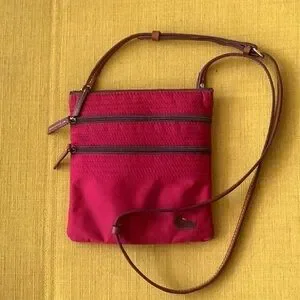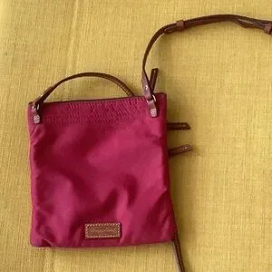 Good used condition. All zippers work. No rips or marks. Body is nylon. Trim is leather. Lining is hot pink.