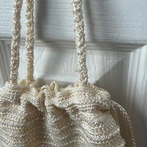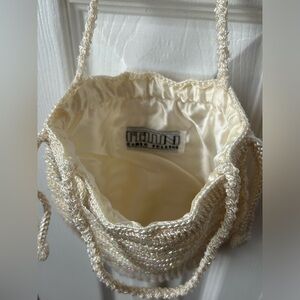 Gorgeous vintage cream drawstring evening handbag. Features a chandelier style, knitted base on front and back with horizontal bead pattern. Beautiful beaded detail on the bottom of the bag with a beaded tassel finish. Drawstrings are a braided cord with beaded circle ends and can be used to close the bag opening. Double handle braided with beads. Satin interior one main compartment. Made in China. Threads missing in one section of the drawstring channel and bead is loose on one of the handles. See photos.