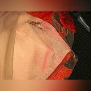 Over time, the delicate mesh has developed visible tears and holes due to wear, adding to the dress’s story and character. Additionally, there are red splotches on the interior lining caused by the original painting process.