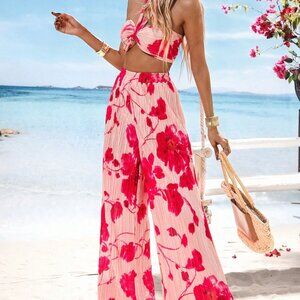 Pink Boho Women's Pleated Crop Top w/Halter Neckline & High Waist Wide Leg Pants