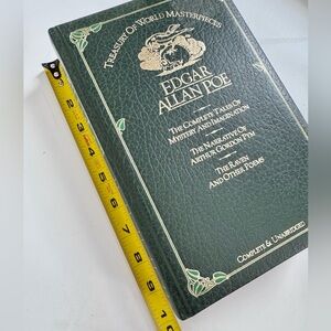 Beautiful faux leather bound book of Edgar Allen Poe features such classics as The Black Cat and The Raven. A collection of stories and poems written by a master of suspense and horror. This is a vintage hardcover book and the pages inside are somewhat yellowed. See photo. No highlighting or marks, no torn pages. For those of us who enjoy the sensory experience of holding a book while reading. This is a classic and filled with masterpieces in a groundbreaking vintage style.
