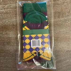Mardi Gras Argyle Socks. Happy Mardi Gras! Purple, yellow and green argyle knit with Mardi Gras worded in white on each pair. OS. Unisex. New with tags.
