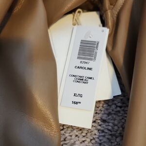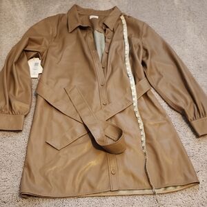 vegan leather, button down with removable tie belt, NWT, XL, buton cuffs. stylish brown women's dress perfect for any occasion. Features a sleek design and comfortable fit.