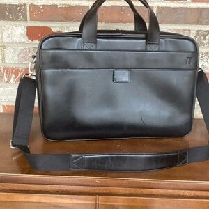 All business, you'll enjoy the luxury and design of the Hartmann Heritage double compartment briefcase. The emphasis is on functionality and refined styling. Made of Hartmann full grained leather, it offers unsurpassed quality. The gun metal hardware is very handsome. You'll appreciate all of the features found in this handsome Hartmann briefcase. Use the double leather carry handles or the removable padded shoulder strap. You can also slide the Hartmann leather brief over the trolley handle of your rolling luggage and it will ride along securely with the handy piggyback strap on the back of the brief. Excellent used condition