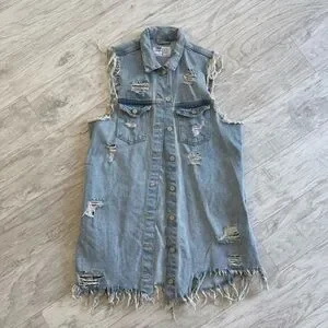 Stylish sleeveless denim vest. Features distressed details. Button-up front. Perfect for layering.