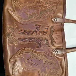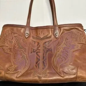 Frye Tote with snakeskin FF. Awesome bag and has really been loved!! Frye leather is made to endure…. This is an awesome bag that has a lot of life left. Please see all photos for measurements and wear. Leather Needs another round of conditioning. Bag is still in good condition with marks, corner wear and leather has relaxed due to wear. Make this one yours!!!😊💕♥️🌷