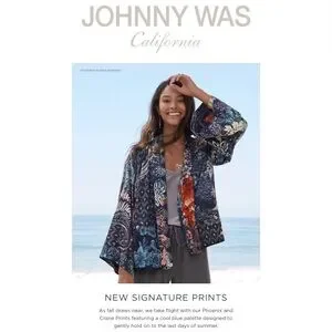 Johnny Was Phoenix Flora Kimono Jacket, featuring a blue-toned floral and paisley print. It is part of the brand's new silk signature prints collection designed for the transition from summer to fall.