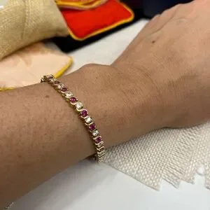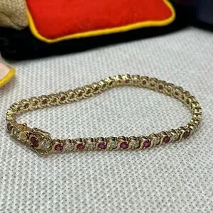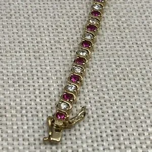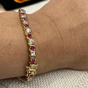 This stunning vintage bracelet is a beautifully crafted piece from my estate collection, kept in pristine condition for over 20+ years. Featuring a classic tennis design, it is adorned with alternating ruby-colored gemstones and sparkling cubic zirconia, all set in gold over solid 925 sterling silver for an elegant yet durable finish.