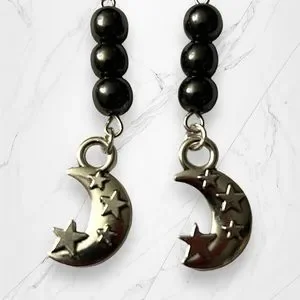 Hand Crafted Hematite + Moon & Star Dangle Earrings