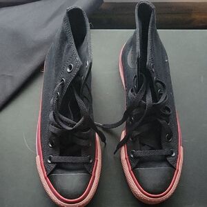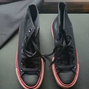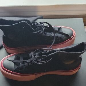 Stylish Converse high-tops. Black canvas with pink soles. Classic lace-up design.