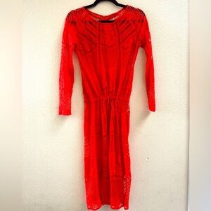 Stunning FREE PEOPLE Red Lace Dress with long sleeves and an adjustable drawstring waistline. May be worn with a slip as a dress for a night out on the town. Dress can also be used as resort wear or vacay appropriate for a stunning bathing suit cover up. Color is a true Conroe tomato red!