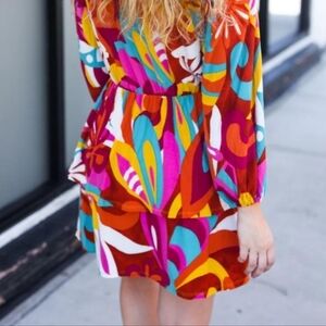 This abstract floral surplice dress features a stunning mix of colors. The V-neckline and flowy fit make it a versatile piece that transitions beautifully from day to night.