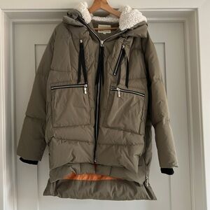 Super warm, trendy coat. Zipper pulls throughout including side vents. EUC, only worn a few times. The color of the stock photos is more accurate than mine.