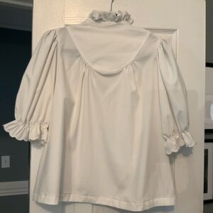 This elegant white top features charming ruffled details and a classic design. Perfect for any occasion, it offers a sophisticated look with its delicate button accents.