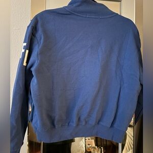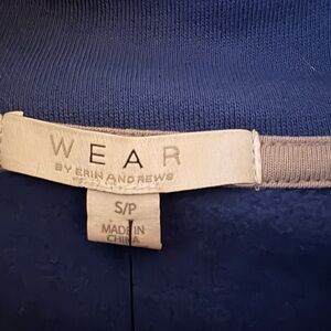 WEAR by Erin Andrews Quarter-Zip Jacket. This midweight outerwear is crafted from cotton, making it a comfortable and breathable option for mild weather. The dropped shoulder seams and cropped hem create a relaxed and trendy look, while the screen-printed graphics and embroidered logos add a touch of flair. Never worn, with tags.