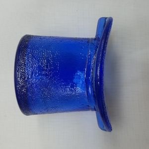 Vintage textured blue glass top hat ashtray with bullseye bottom. 3" x 2 ½" and 2 ⅞" tall. Unknown maker. Has some swirls inside the glass from what looks to be unmixed material, a manufacturing defect on the rim, and a tiny flat chip flea bite on other side of rim ( see last 4 pics ).
