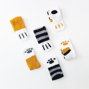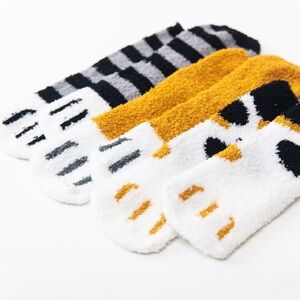 Cozy and cute cat paw socks. Perfect for lounging. Includes three pairs with fun designs. Slip on these fuzzy cat socks and keep your feet comfy with three pairs of plush paws!