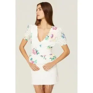 Rent the Runway previously worn piece, but in excellent condition! Puff sleeves enhance the airy ease of this floral print top by Slate & Willow. White floral printed (100% Rayon). V-neck. Short sleeves. Pull-on. Size small.