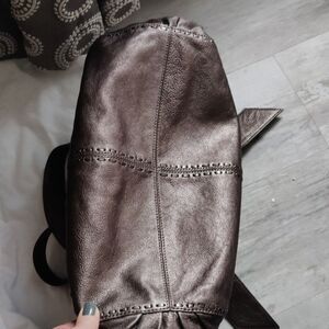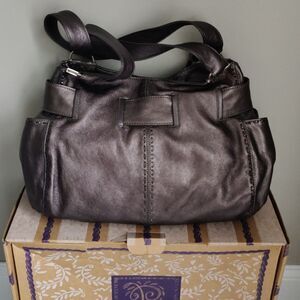 Wow this gorgeous Brighton Clara bag is in like new condition! No signs of wear on or in the bag. Minor discoloration on the logo heart charm...see photo. The outside is soft leather featuring 2 side pockets, magnetic closure and belt like tie. Pretty taupe metallic color. Inside features Brighton floral fabric with a zipper pocket and two phone pockets. Retail $330.