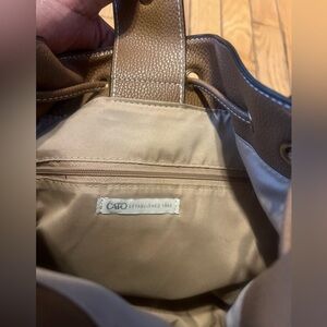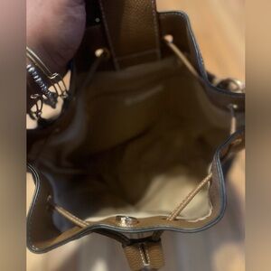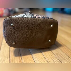 Stylish patchwork leather bucket bag featuring a mix of brown and black tones. Perfect for adding a bold statement to any outfit.