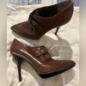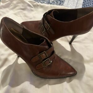 Gently worn. Women’s size 8 dress boots with 4.5” heel. Cute buckles on front give the shoes a little flair. Heels are scuffed up on bottom to prevent slipping when walking on slick surfaces.