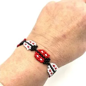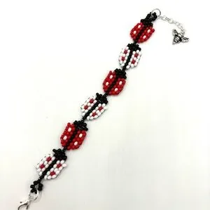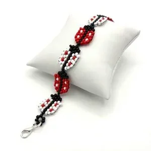 Fun handmade beaded bracelet with red, white and black 8/0 seed beads woven into an adorable connected ladybug pattern.