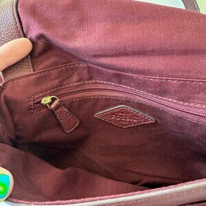 Fossil • Preston Burgundy Wine Leather Flap Crossbody Purse with a secret pocket as well as a secure zip back pocket and magnetic snap closure. Beautiful wine red color