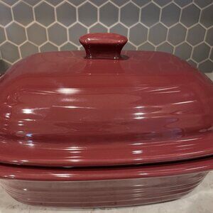 NWOT The pampered Chef 3.1 Qt. Casserole Dish! Stoneware ceramic, Cranberry color, unglazed interior is ideal for baking. Stoneware baker for oven ( up to 450*) or microwave! Retains heat and flavors, hand wash. Made in the USA Classic casserole design with lid that can be inverted ( see pic) for storage.