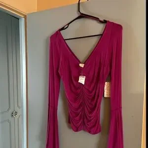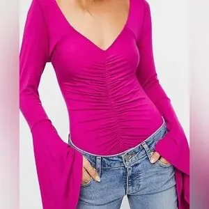 Free People Top “What a Babe” – a very pretty and stylish pink top with V-neck, V-back and long dramatic bell sleeves. Lightweight fabric, stretchy, great fit. Very elegant, sexy and feminine style.
