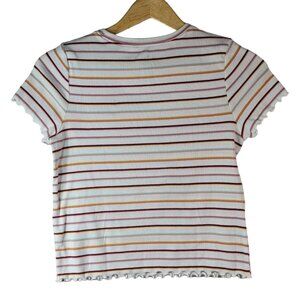 SO Girls White Stripe Red Yellow Green Top Round Neck Curly Lettuce Hem Trim Pullover. Excellent pre-owned condition with no stains or tears.