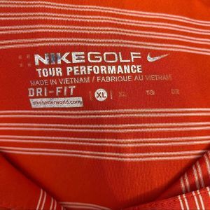 Nike Golf Tour Performance Orange Striped Short Sleeve Polo Shirt! Size XL. Black Nike Swoosh Logo! Inside tag has some markings on it.