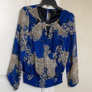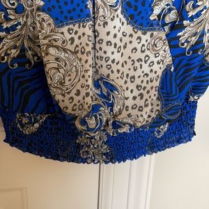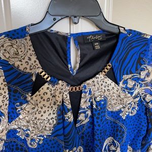 Beautiful animal print top with gold chain embellishment. Elastic band bottom. Machine washable