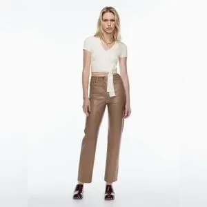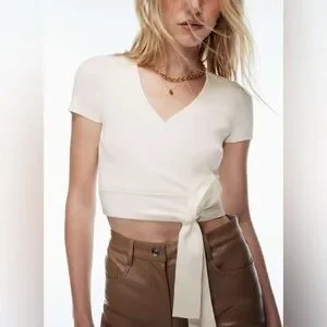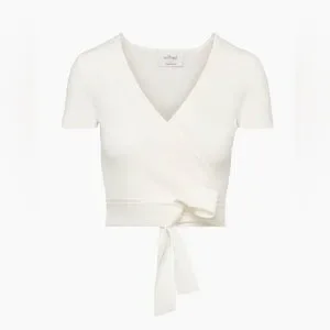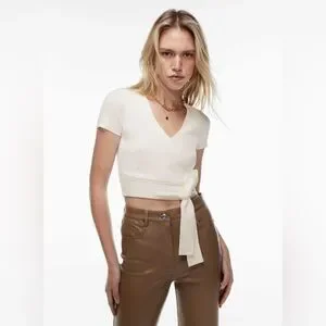 This is a short-sleeve wrap sweater with a tie at the waist. It’s rib-knit with soft, spongey, all-season yarn made with LENZING™ ECOVERO™ Viscose — responsibly sourced wood-based fibres produced through a process that reduces impact on forests, biodiversity and water supply.
