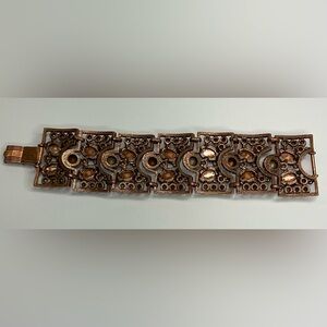 Vintage Sweet Romance Rhinestone Glass Chunky Cuff Bracelet. This stunning 7 3/4” bracelet features a vibrant array of gemstones set in copper with blue, green, and gold stones. Perfect for adding a pop of color to any outfit.