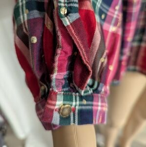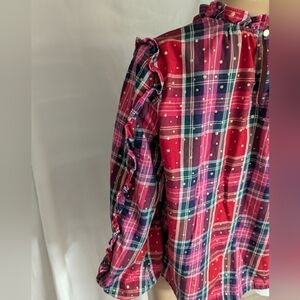 Crown and Ivy red pink gold foil polka dots ruffled long sleeve blouse sz L, back keyhole button closure ruffles around the neck and down the sleeves, EUC, no flaws, red pink green purple with gold metallic accents