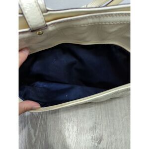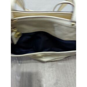 This Coach Diaper Bag/Tote is a stylish and practical accessory for any on-the-go mom. With a spacious interior and multiple pockets, it's perfect for carrying all your baby essentials. The bag features a zip closure and is made of high-quality leather with gold hardware accents. The off white handle/strap material adds a touch of elegance to the off-white exterior color.