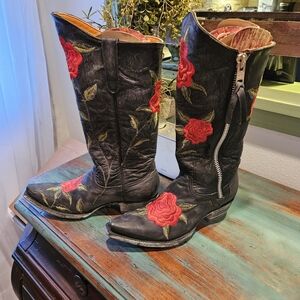 black leather with roses embroidery...size 8.5 med. side zipper...perfect condition.